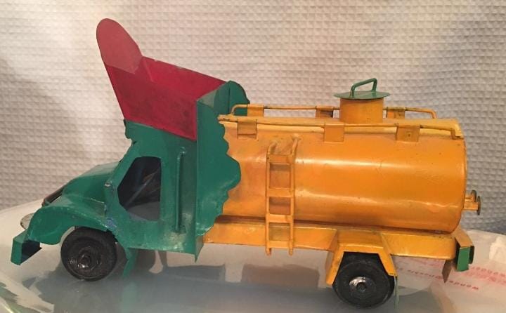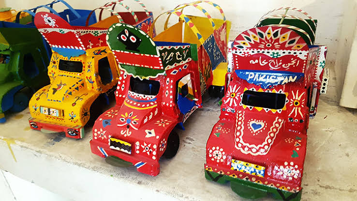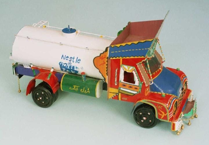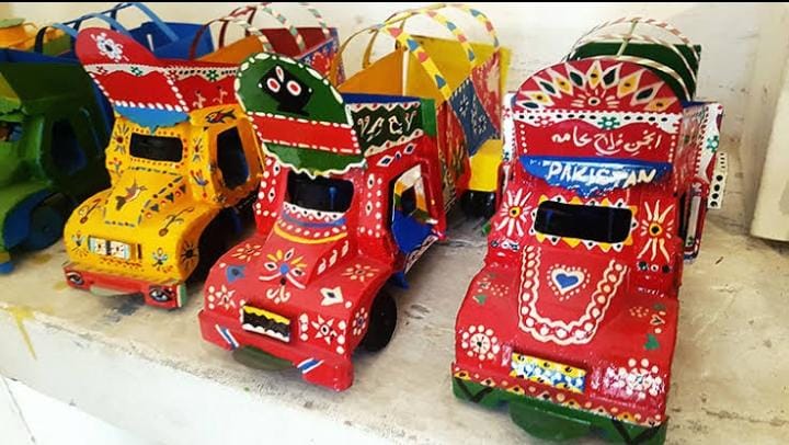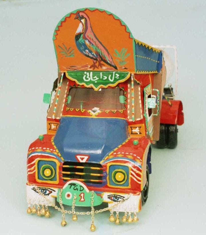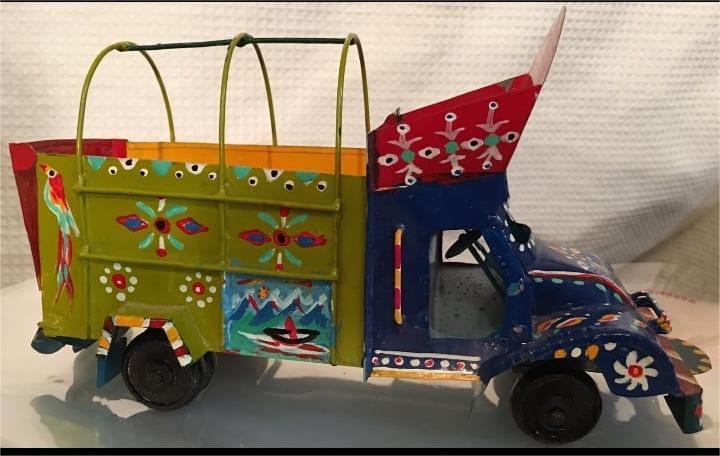 🔸Truck different models made with iron plate. About many pieces soldered together. Painted with oil coloures and brush differant motives painted on front and back. Sides are painted too to show Pakustan art on wheals.